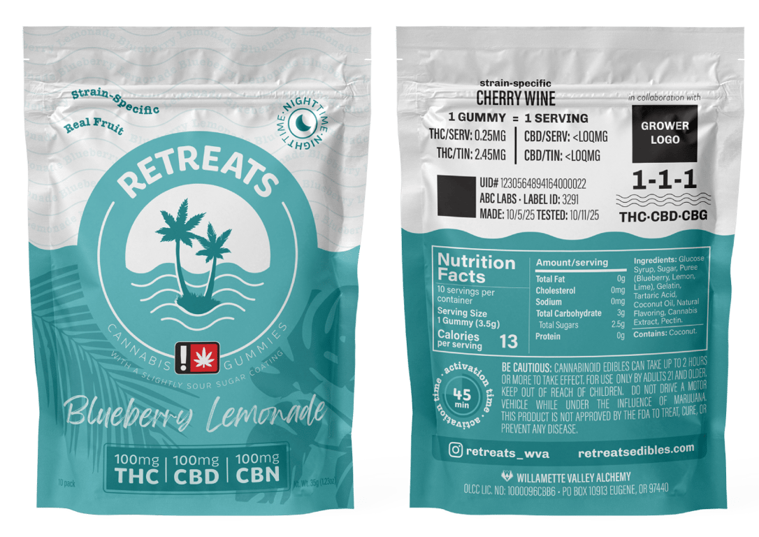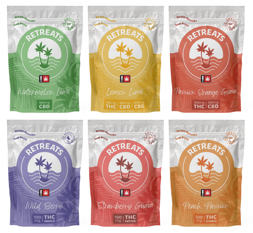Before we produced any mockups, I talked to several bud tenders (and some customers) to learn how customers chose gummies. The results were mixed, but were what I expected – by flavor, brand recognition, effect or best time of use, ingredients, and some even shop by product size (how many pieces they need to eat). It was imparative that the new packaging have bolder indicators of all of these specifications. We made it much easier for customers to compare the entire Retreats line and easily choose the gummy that best fits their needs.